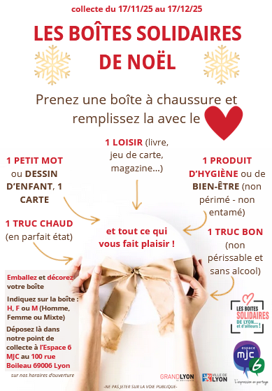 Cette année encore, l’Espace 6 MJC participe aux Boîtes Solidaires de Noël, une initiative citoyenne qui permet de répandre un peu de magie et de solidarité en cette période de fêtes. 🌟